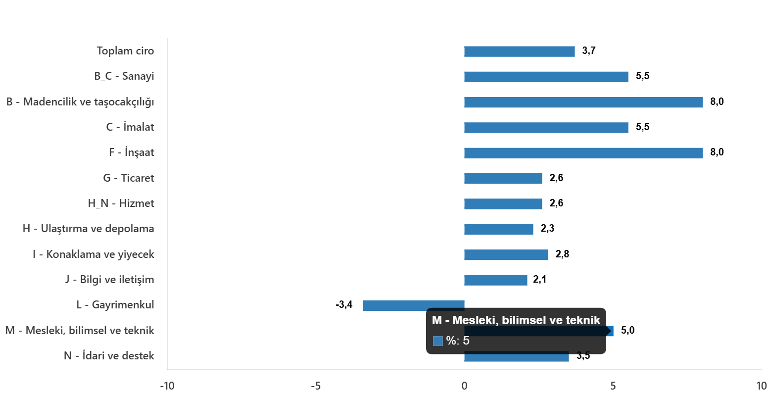 Toplam cironun alt detaylarına bakıldığında; 2025 yılı Kasım ayında aylık sanayi sektörü ciro endeksi %5,5 arttı, inşaat ciro endeksi %8,0 arttı, ticaret ciro endeksi %2,6 arttı, hizmet ciro endeksi %2,6 arttı.